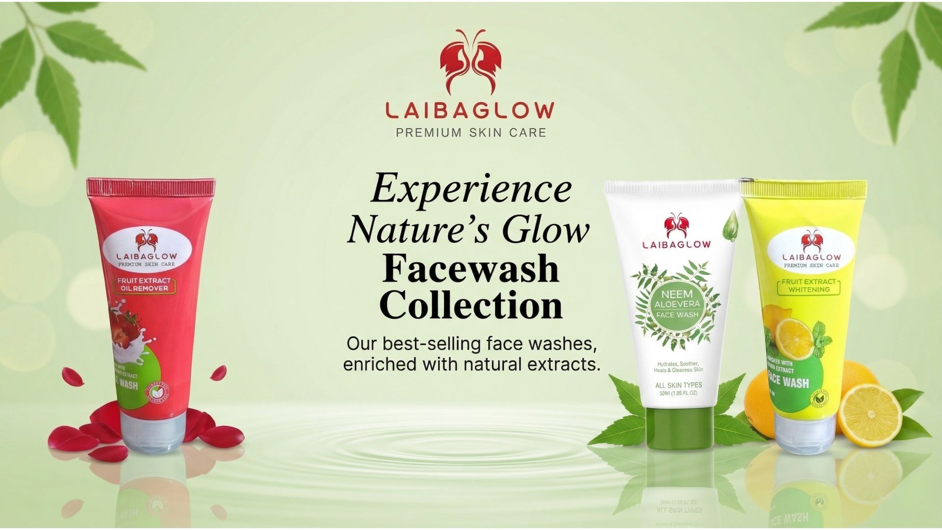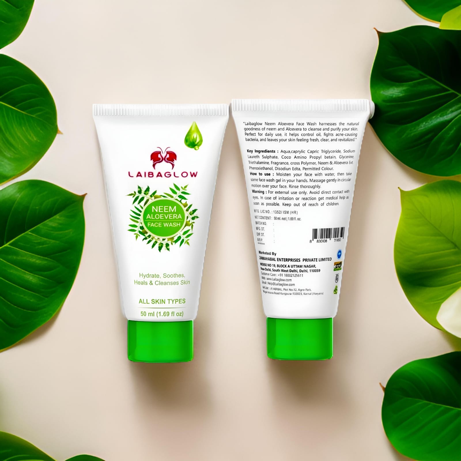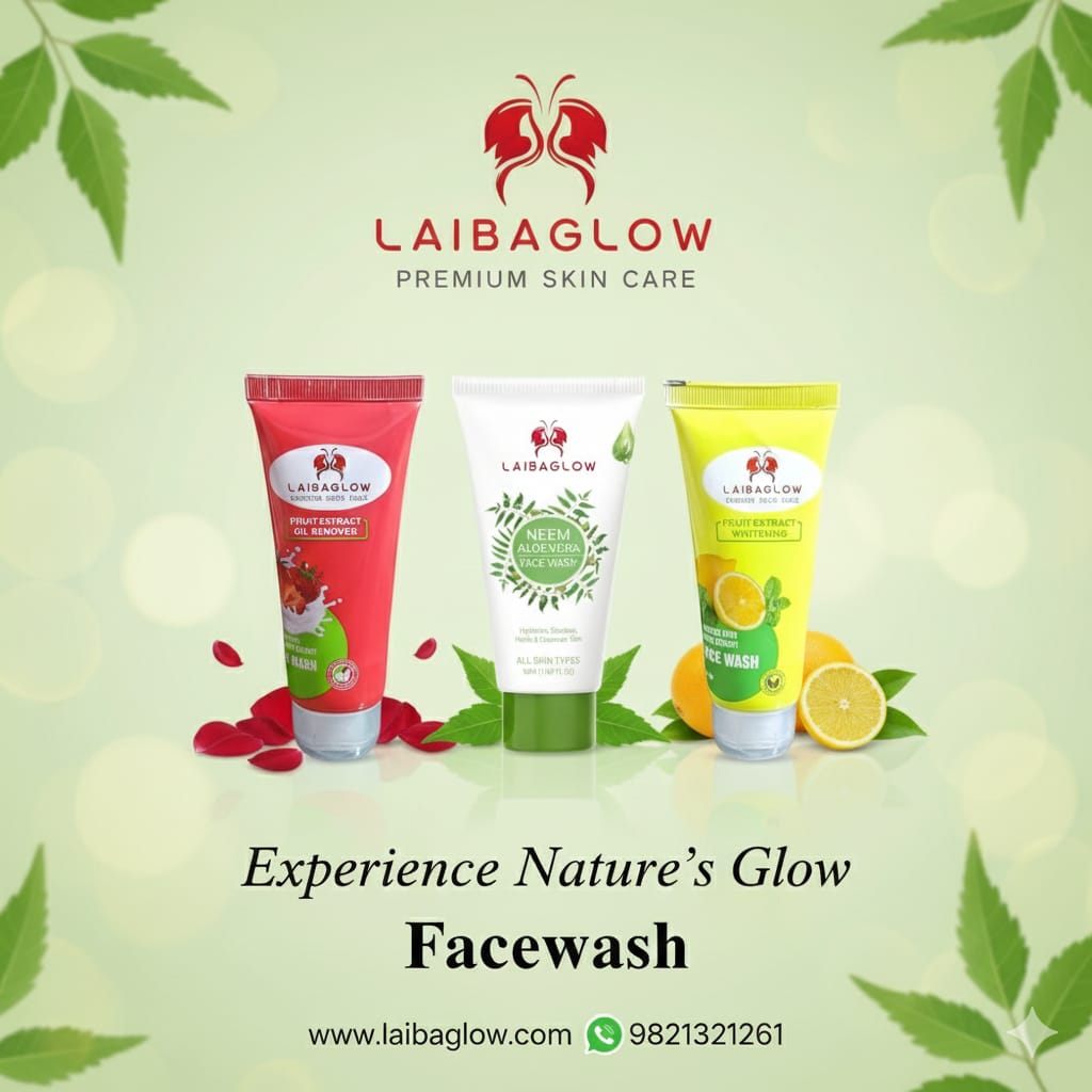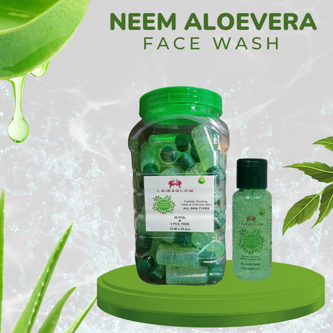 Laibaglow Neem Aloe Vera Face Wash is enriched with natural neem and aloe vera extracts that help cleanse, hydrate, and soothe your skin. It effectively controls oil, fights acne, and leaves your skin fresh, clear, and glowing. Suitable for all skin types.