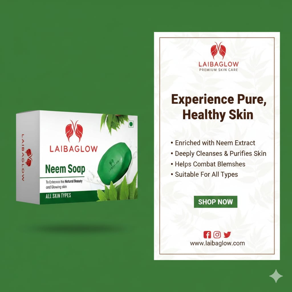 Laibaglow Neem Soap is a natural skincare solution enriched with neem extracts that deeply cleanses, removes impurities, and helps protect your skin from acne and bacteria. Suitable for all skin types, it promotes healthy, glowing, and refreshed skin with every use.